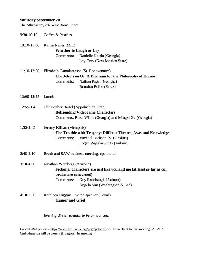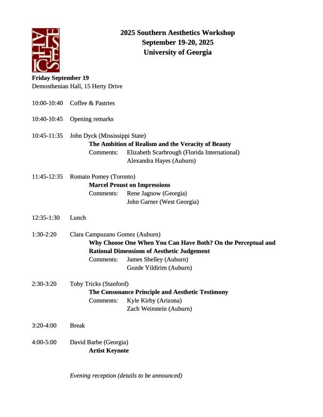 Friday, September 19 2025, 9:30am - 5pm Saturday, September 20 2025, 9:30am - 5pm Demosthenian Hall & The Athenaeum Scholars from throughout the region will gather on UGA's campus September 19-20 for the Southern Aesthetics Workshop. The public is welcome to attend Friday's keynote address by David Barbe of University of Georgia at 4pm in Demosthenian Hall as well as the talk on "Humor and Grief" by invited lecturer Kathleen Higgins of University of Texas on Saturday at 4:15pm in The Athenaeum. The schedule of events is below: